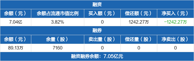 融资方面,当日融资买入0元,融资偿还1242.27万元,融资净偿还1242.27万元,连续11日净偿还累计3.6亿元。融券方面,融券卖出0股,融券偿还0股,融券余量7160股,融券余额89.13万元。融资融券余额合计7.05亿元。