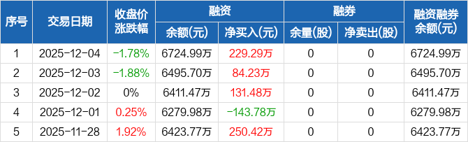 融资方面,当日融资买入302.08万元,融资偿还72.79万元,融资净买入229.29万元,连续3日净买入累计445万元。融券方面,融券卖出0股,融券偿还0股,融券余量0股,融券余额0元。融资融券余额合计6724.99万元。