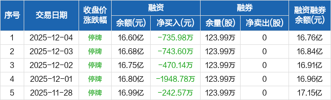 融资方面,当日融资买入0元,融资偿还735.98万元,融资净偿还735.98万元,连续11日净偿还累计1.43亿元。融券方面,融券卖出0股,融券偿还0股,融券余量123.99万股,融券余额1627.99万元。融资融券余额合计16.76亿元。