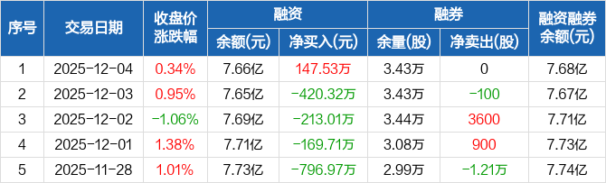 融资方面,当日融资买入426.37万元,融资偿还278.84万元,融资净买入147.53万元。融券方面,融券卖出0股,融券偿还0股,融券余量3.43万股,融券余额205.15万元。融资融券余额合计7.68亿元。