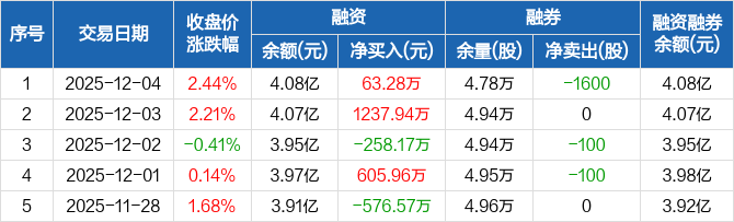 融资方面,当日融资买入4921.63万元,融资偿还4858.35万元,融资净买入63.28万元。融券方面,融券卖出0股,融券偿还1600股,融券余量4.78万股,融券余额36.18万元。融资融券余额合计4.08亿元。