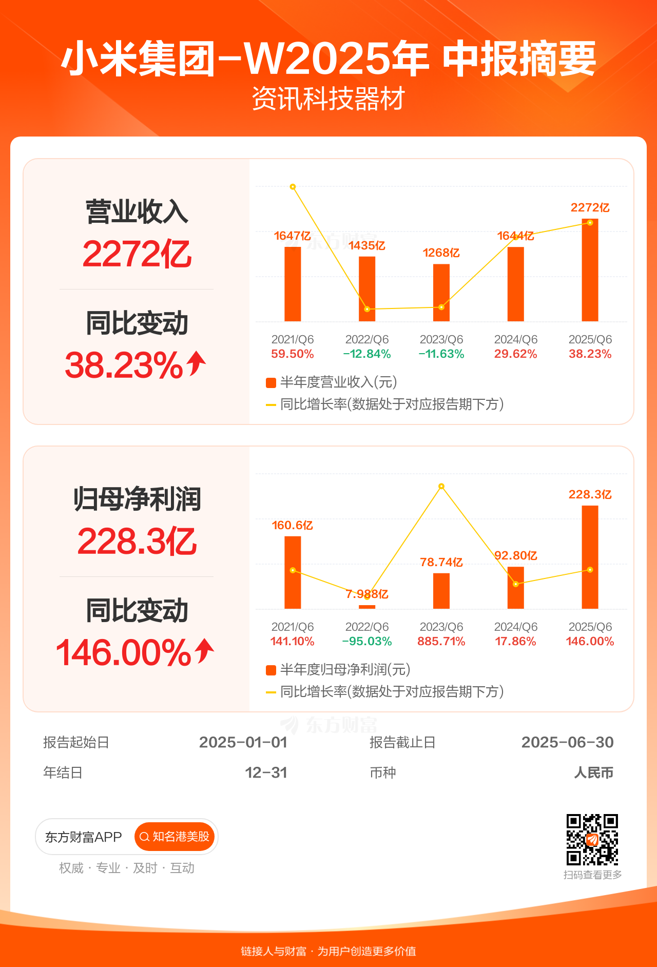 小米集团-W8月19日发布中期业绩,截至2025年6月30日的6个月内,该公司营业收入2272.49亿元(人民币,下同),同比增长38.23%;公司权益持有人应占溢利(归母净利润)228.29亿元,同比增长146.00%。