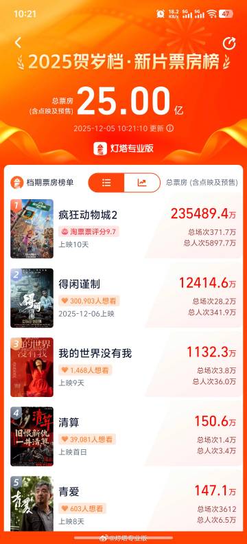 据灯塔专业版,截至12月5日,2025年贺岁档上映新片总票房(含预售)突破25亿,影片《疯狂动物城2》《得闲谨制》《我的世界没有我》位列前三。