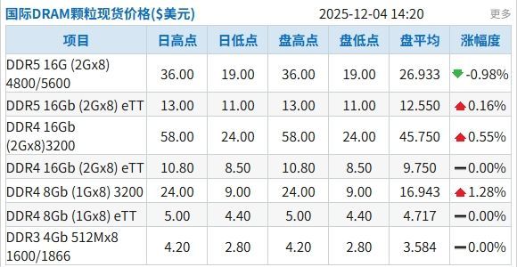 南方财经12月4日电,据集邦数据,今日国际DRAM颗粒现货价格整体相对稳定,涨幅仍集中于DDR4部分颗粒,DDR5部分颗粒仍有小幅下跌。具体来看,DDR5 16G (2Gx8) 4800/5600今日下跌0.98%,均价为26.933美元;DDR4 16Gb (2Gx8) 2666今日仍保持一定涨幅,上涨2.11%,均价为35.714美元。
