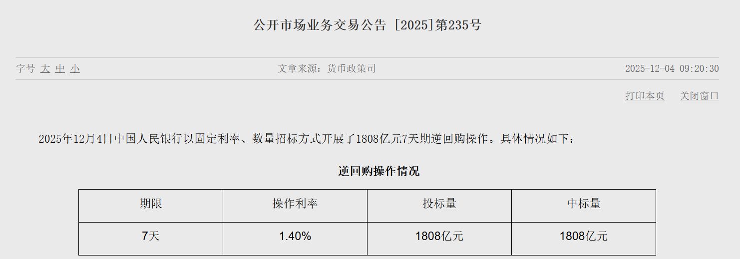 12月4日,央行公告,为保持银行体系流动性充裕,2025年12月5日,中国人民银行将以固定数量、利率招标、多重价位中标方式开展10000亿元买断式逆回购操作,期限为3个月(91天)。