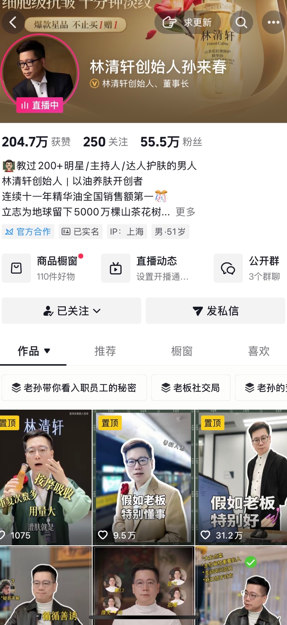 林清轩在各类线上内容平台的运营中,也呈现出高度依赖“人格化曝光”的特点。创始人孙来春、孙福春,以及家族成员孙福春儿子“小孙总”,乃至总裁助理、品牌合伙人,都在开设个人账号以塑造不同形象IP为品牌引流。在 CBE 美博会等行业展会上,界面时尚也曾多次看到孙来春亲自站在展位前直播卖货。