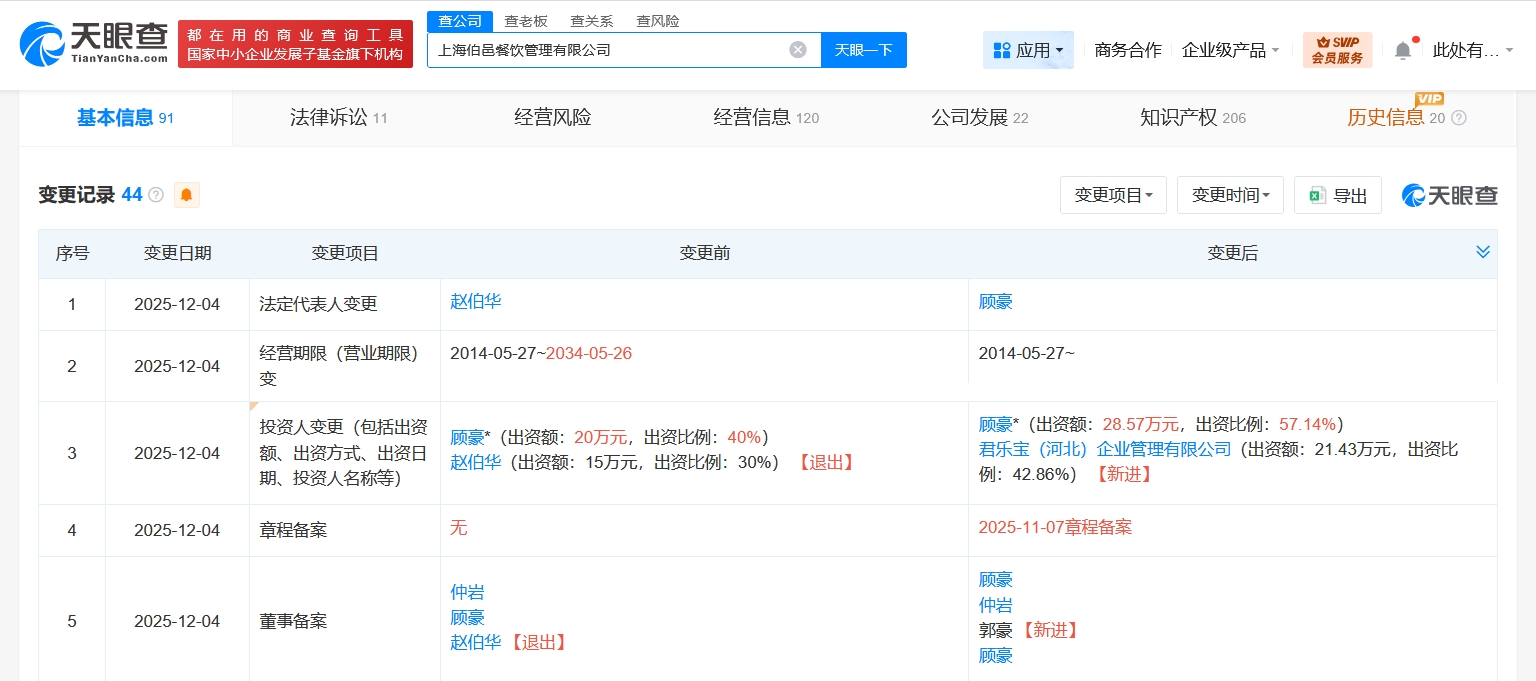 南方财经12月5日电,天眼查工商信息显示,近日,茉酸奶关联公司上海伯邑餐饮管理有限公司发生工商变更,赵伯华卸任法定代表人、总经理、董事、财务负责人并退出股东行列,由顾豪接任法定代表人,新增郭豪为经理、董事,新增张燕芳为财务负责人。上海伯邑餐饮管理有限公司成立于2014年5月,注册资本50万人民币,经营范围含餐饮管理、餐饮服务、食品销售、食用农产品批发、食用农产品零售、厨具卫具及日用杂品批发、企业管理咨询、租赁服务、珠宝首饰批发、电子产品销售等。股东信息显示,该公司现由顾豪、君乐宝(河北)企业管理有限公司分别持股约57%、43%。公开信息显示,茉酸奶是现制酸奶品牌,创始人为赵伯华,品牌始创于2014年。2019年,顾豪作为加盟商加入了茉酸奶,2022年3月,顾豪持股茉酸奶。