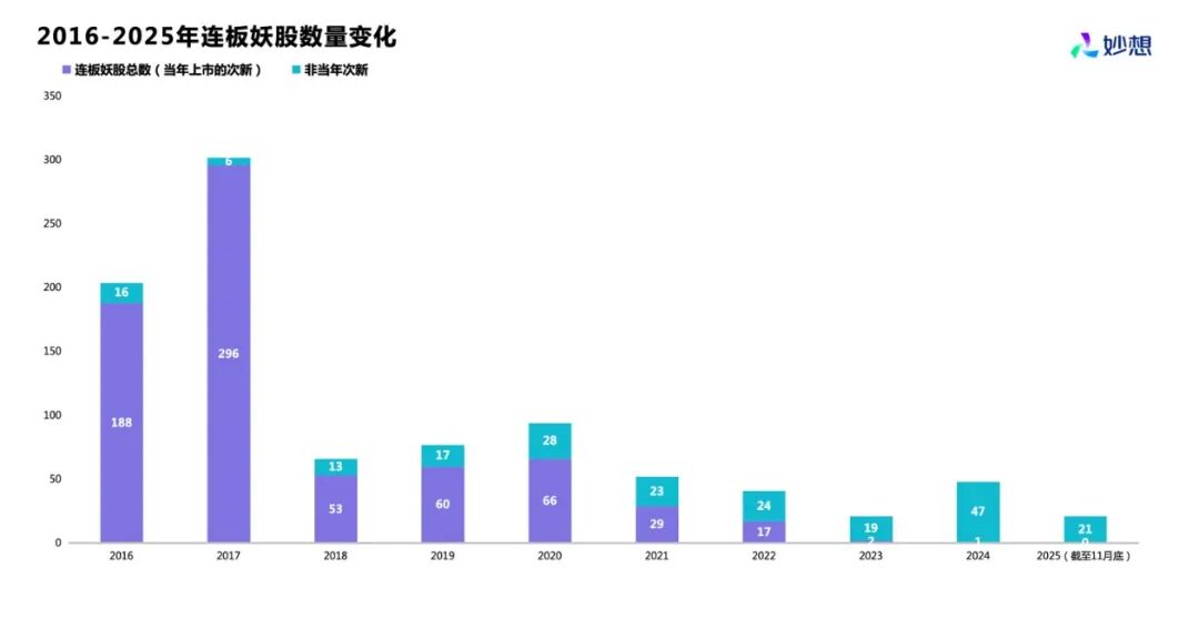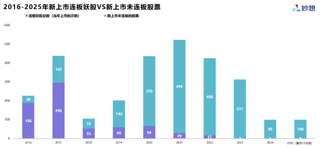 图表3:2016-2025年新上市连板妖股VS新上市未连板股票