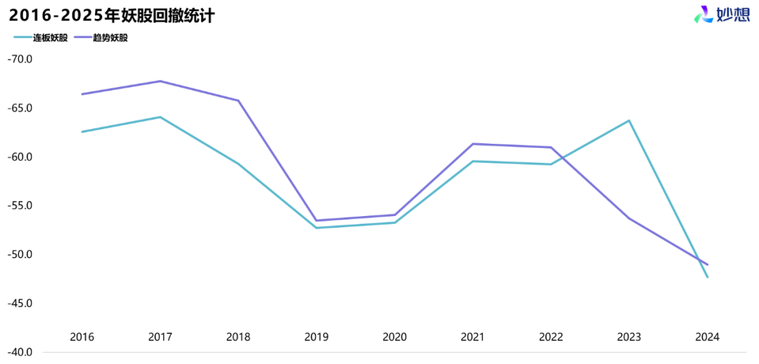 数据给出了残酷答案:两种类型的妖股在“成妖”大涨后的次年回撤幅度几乎持平。2016-2024年,连板妖股与趋势妖股的次年平均回撤率分别为58.1%和59.2%,差距微乎其微。