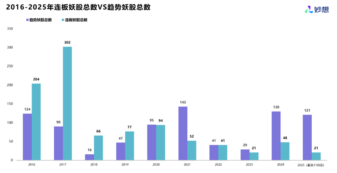 “炒新”退潮后,市场投机热情转向了趋势型妖股:年内最大涨幅超300%的趋势型妖股数量从2018年的16只激增至2021年的143只;此后虽随市场调整有所回落,但 2024 年及2025 年(截至11月)数量再度回升至 120 只以上,规模已超越 2016-2018 年的连板妖股鼎盛时期。