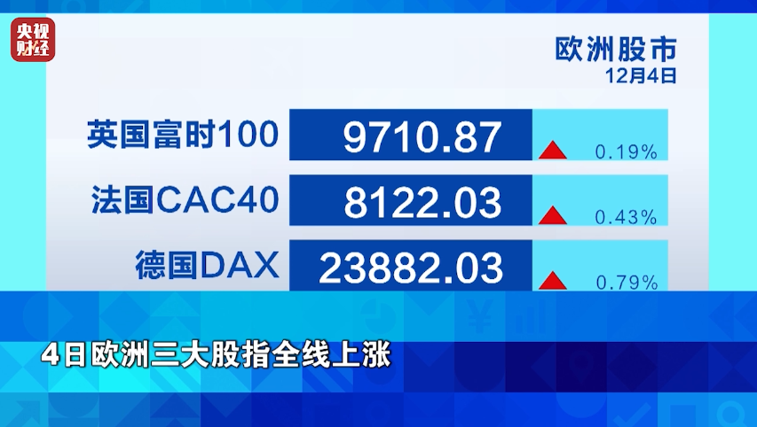 欧洲方面,投资者密切关注俄乌和平谈判进展。欧盟统计局周四公布的数据显示,欧元区10月零售销售额同比增长1.5%,好于预期,表明消费呈现复苏态势,这提振了投资者信心。截至当天收盘,欧洲三大股指集体上涨,但涨幅不大。其中,英国富时100指数上涨0.19%,法国CAC40指数上涨0.43%,德国DAX指数涨幅为0.79%。