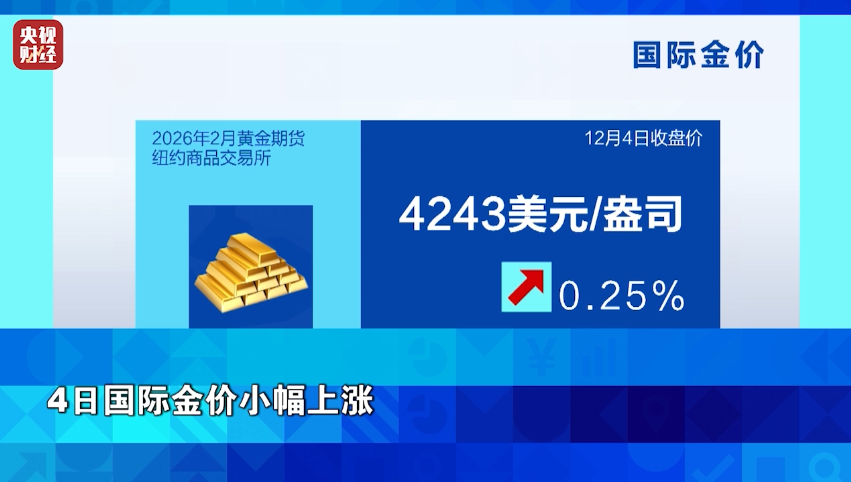 贵金属市场上,世界黄金协会周四发布报告预计,2026年黄金价格有望在现有基础上上涨15%至30%,叠加美联储降息预期升温,多重因素推动国际金价上涨。截至收盘,纽约商品交易所明年2月交割的黄金期货价格报每盎司4243美元,涨幅为0.25%。