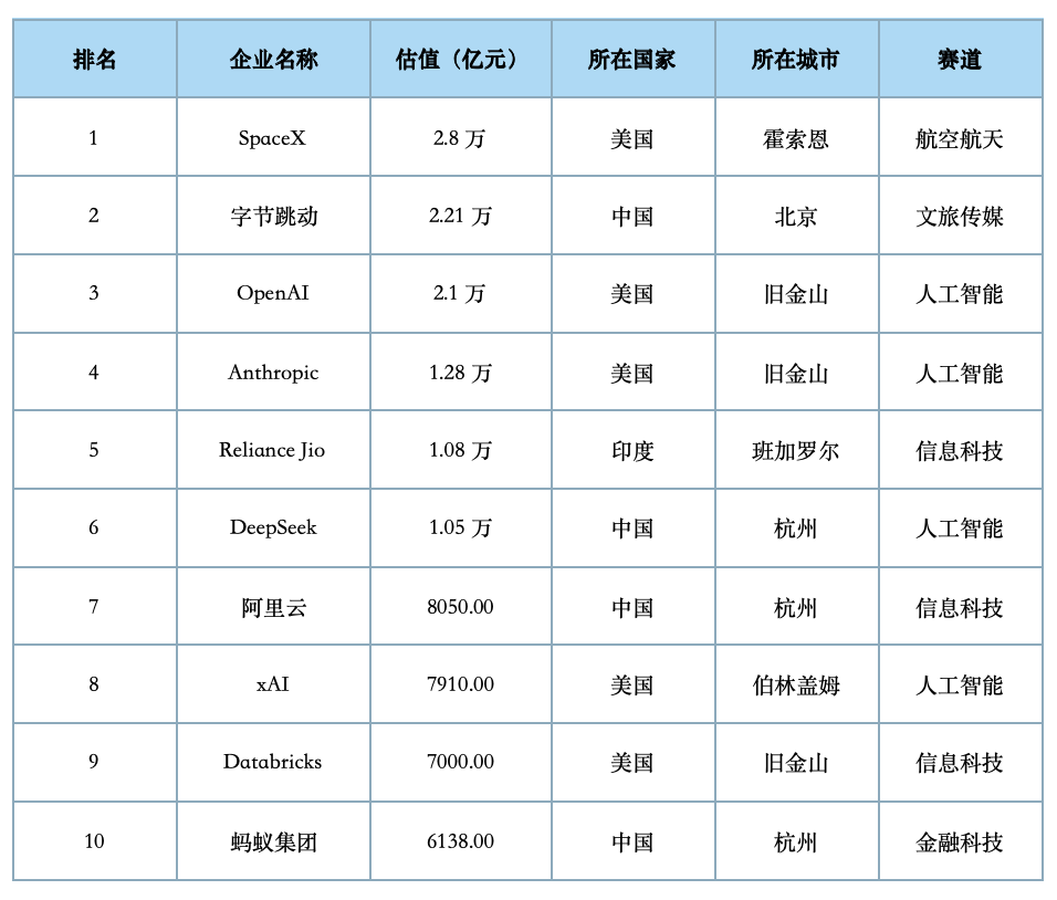 中国AI独角兽表现尤为亮眼,从2家增至9家,涨幅达350%,凸显政策与资本的双重赋能。DeepSeek等企业通过生成式AI与模块化技术深耕垂直场景,推动技术商业化落地。与此同时,字节跳动凭借算法优化内容推荐、蚂蚁集团依托智能风控跻身全球前十,阿里云则通过AI赋能云计算服务,共同构筑中国独角兽的头部阵营。
