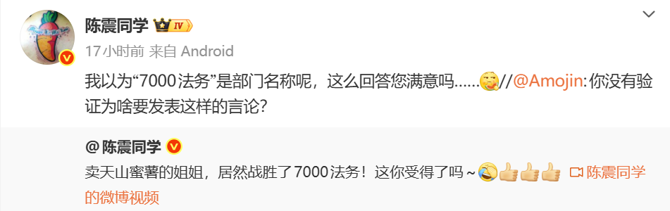 近期,陈震在社交平台上较为活跃。在点赞小米基金会捐赠1000万港元后,陈震被部分网友吐槽“阴阳捐款”,陷入争议。随后,陈震再次就“7000法务”等相关话题与网友开启“互怼”模式,被指影射小米公司、传播虚假信息、蹭热点。