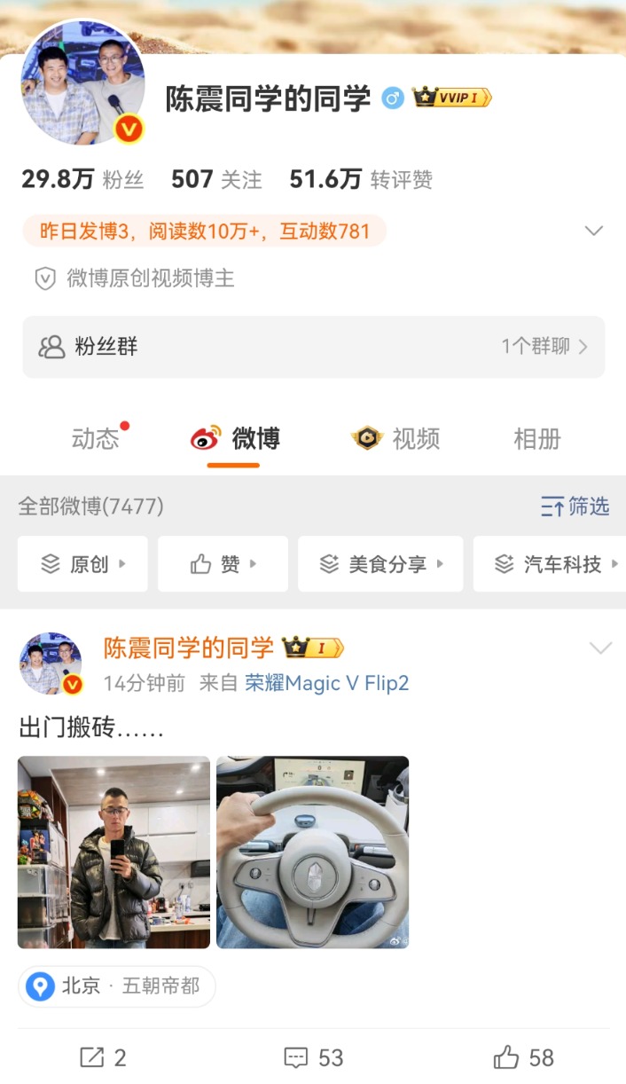 公开信息显示,陈震是资深车评人、萝卜报告创始人,曾为汽车之家员工。陈震早年为知名车手,曾有“二环十三郎”的外号,取自“13分钟开车绕北京二环一圈”之意。数据显示,陈震全网粉丝超2400万人,其中在微博、抖音的粉丝均超1000万人。