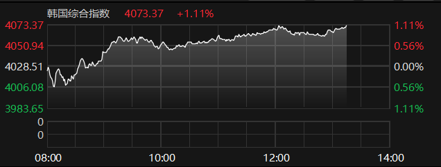 上证报中国证券网讯 12月5日,韩国综合指数涨超1%。截至北京时间13时13分,该指数涨1.11%。