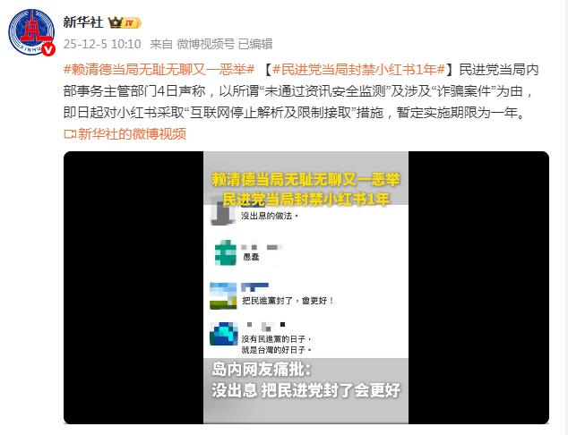 据新华社微博消息,民进党当局内部事务主管部门4日声称,以所谓“未通过资讯安全监测”及涉及“诈骗案件”为由,即日起对小红书采取“互联网停止解析及限制接取”措施,暂定实施期限为一年。