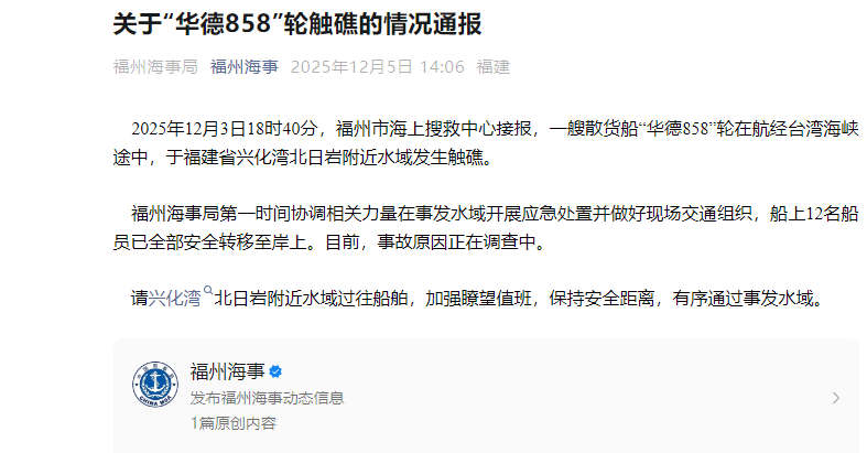 每经AI快讯,福州海事局公众号12月5日通报:12月3日18时40分,福州市海上搜救中心接报,一艘散货船“华德858”轮在航经台湾海峡途中,于福建省兴化湾北日岩附近水域发生触礁。福州海事局第一时间协调相关力量在事发水域开展应急处置并做好现场交通组织,船上12名船员已全部安全转移至岸上。目前,事故原因正在调查中。福州海事局提醒,请兴化湾北日岩附近水域过往船舶,加强瞭望值班,保持安全距离,有序通过事发水域。