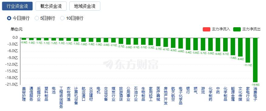 净流出方面,消费电子、家电行业、文化传媒等净流出排名靠前,其中消费电子净流出19.89亿元。