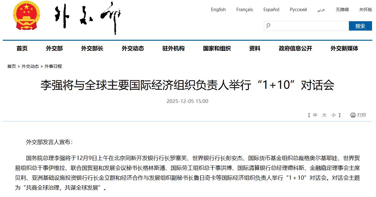李强将与全球主要国际经济组织负责人举行“1+10”对话会