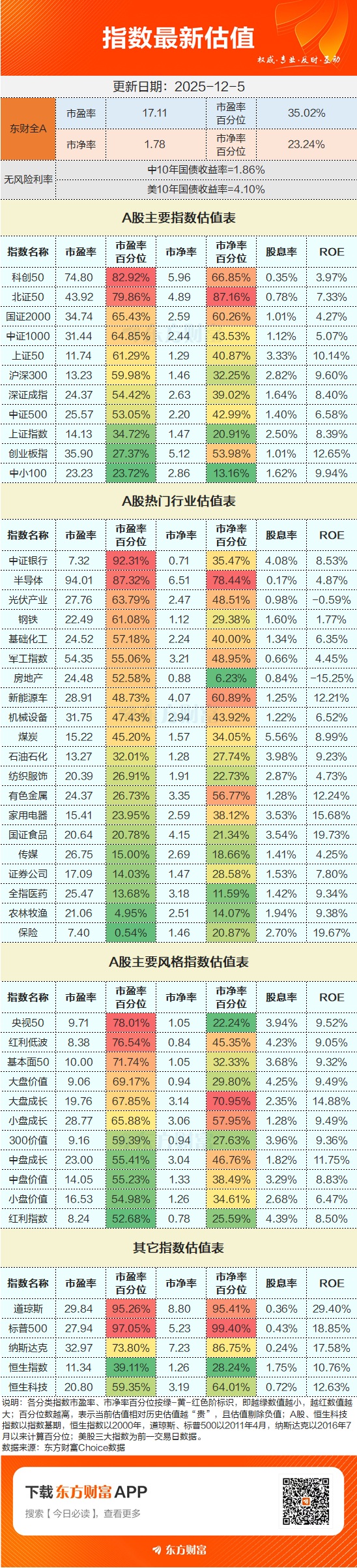 截至12月5日收盘,东方财富Choice数据显示,东财全A市盈率为17.11倍,市盈率百分位为35.02%;市净率为1.78倍,市净率百分位为23.24%。