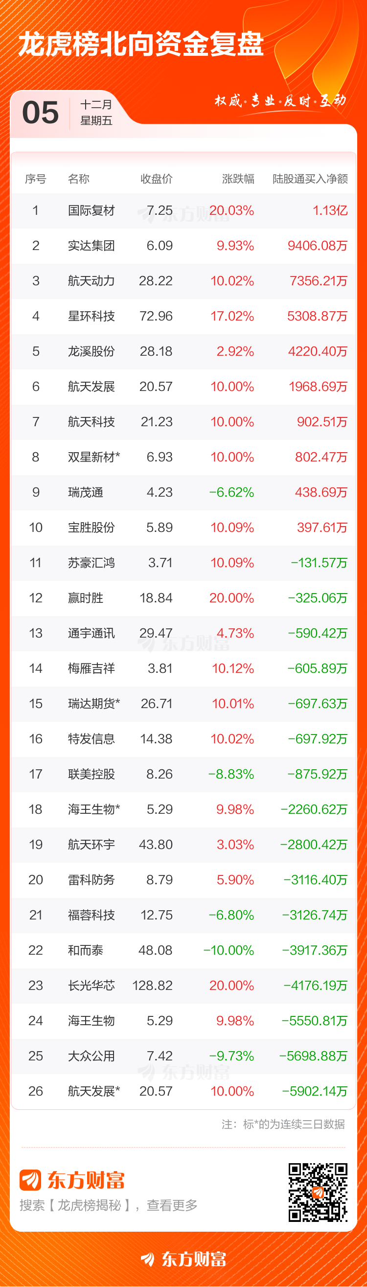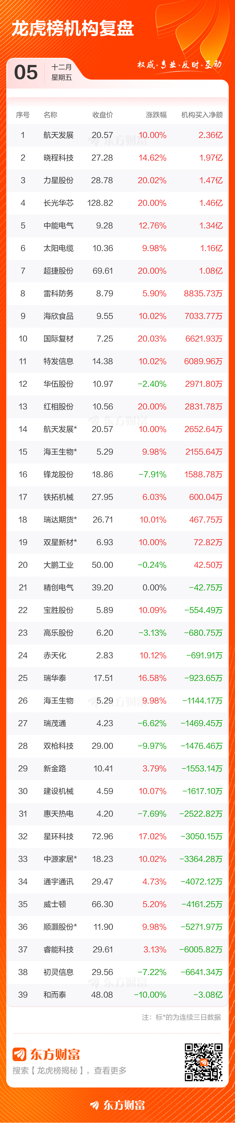 12月5日共有56只个股上榜龙虎榜,总上榜成交额218.01亿元。上榜个股中净买入额最高的是航天科技,金额为3.28亿元。