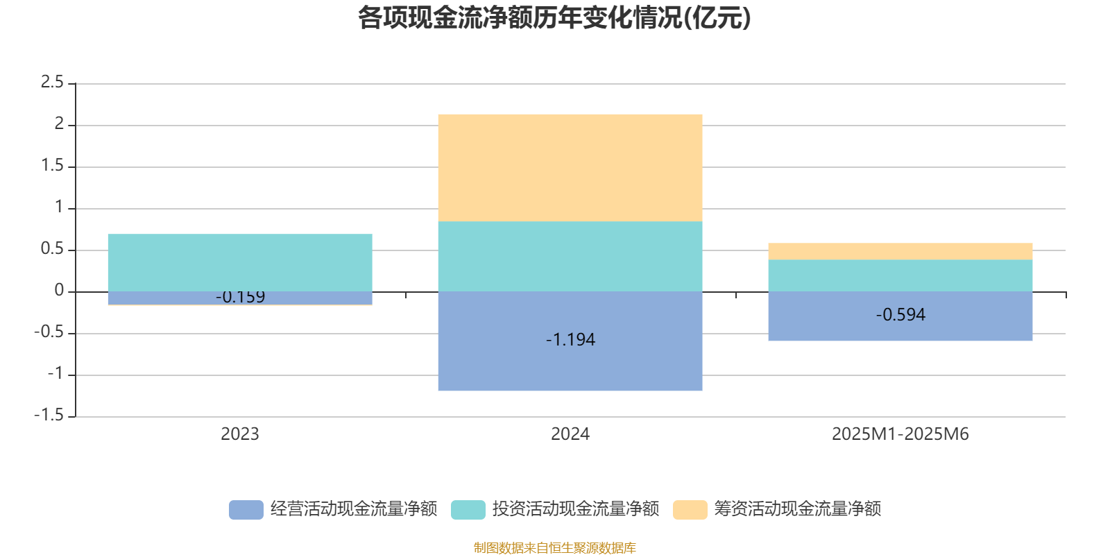 2025年1月至6月,公司经营活动现金流净额为-5936.7万元,同比增加1161.9万元;筹资活动现金流净额1985万元,同比减少6931.3万元;投资活动现金流净额3819.6万元,上年同期为-265万元。
