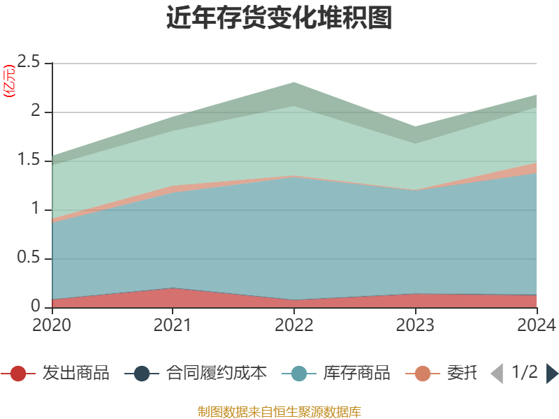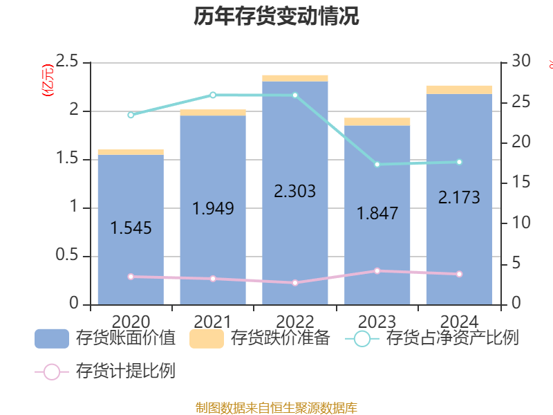 从存货变动来看,截至2024年末,公司存货账面价值为2.17亿元,占净资产的17.64%,较上年末增加3263.17万元。其中,存货跌价准备为846.33万元,计提比例为3.75%。