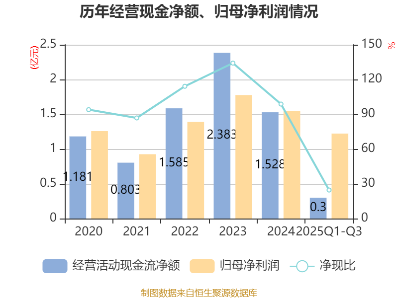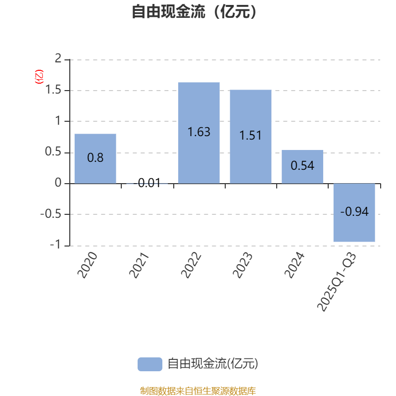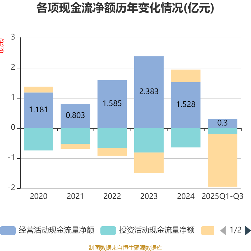 2025年前三季度,公司经营活动现金流净额为3004.92万元,同比增加5473.06万元;筹资活动现金流净额-1.76亿元,同比减少2.24亿元;投资活动现金流净额-1890.72万元,上年同期为-3342.9万元。