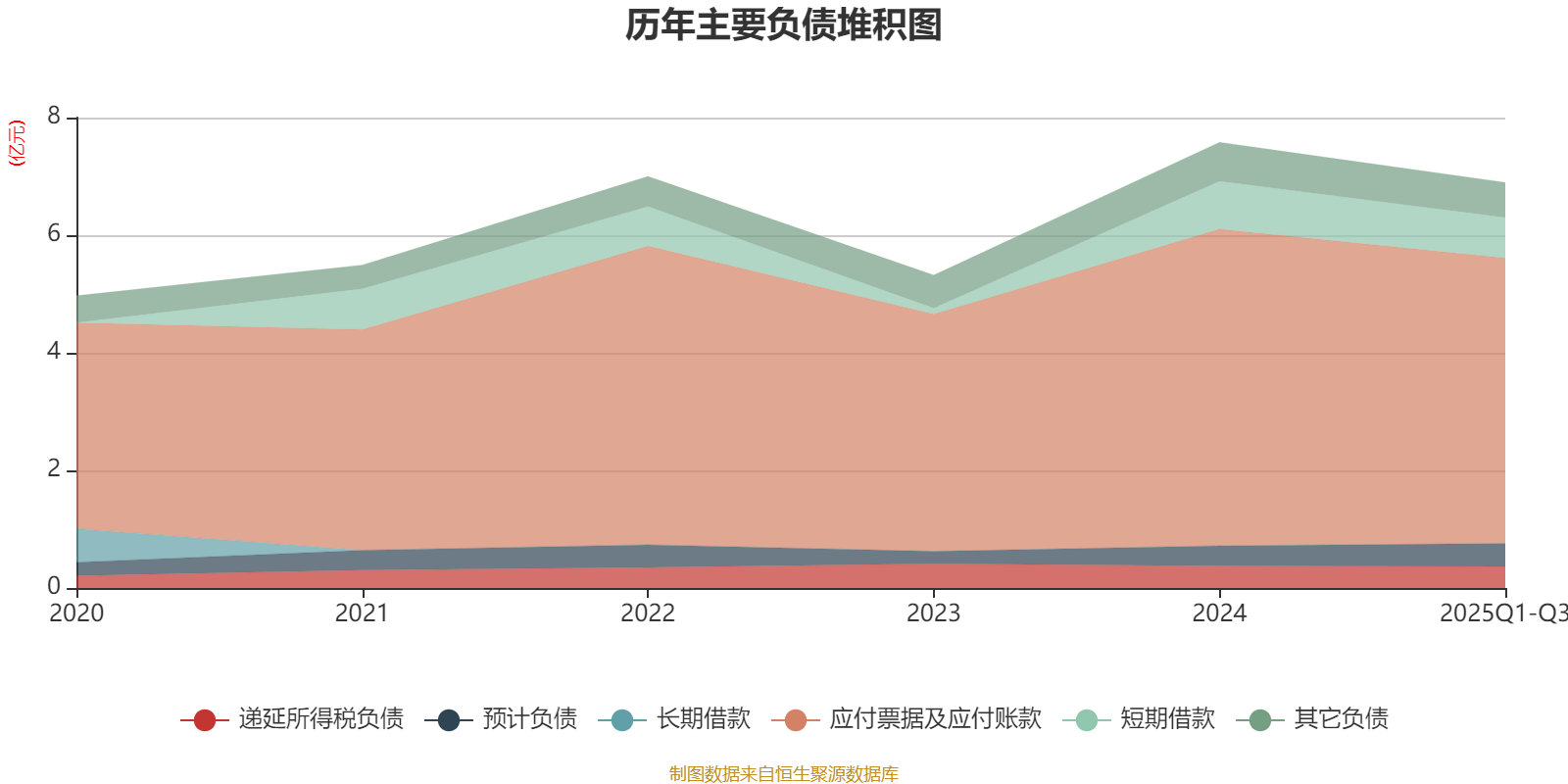 负债重大变化方面,截至2025年三季度末,公司应付票据及应付账款较上年末减少9.87%,占公司总资产比重下降3.35个百分点;短期借款较上年末减少15.1%,占公司总资产比重下降0.71个百分点;应交税费较上年末减少24.63%,占公司总资产比重下降0.38个百分点;预计负债较上年末增加14.48%,占公司总资产比重上升0.19个百分点。