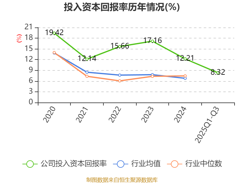 公司2024年投入资本回报率为12.21%,较上年同期下降4.95个百分点。2025年前三季度投入资本回报率为8.32%,较上年同期下降11.85个百分点。