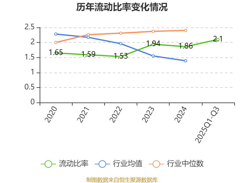 2024年,公司流动比率为1.86,速动比率为1.54。2025年前三季度,公司流动比率为2.1,速动比率为1.78。