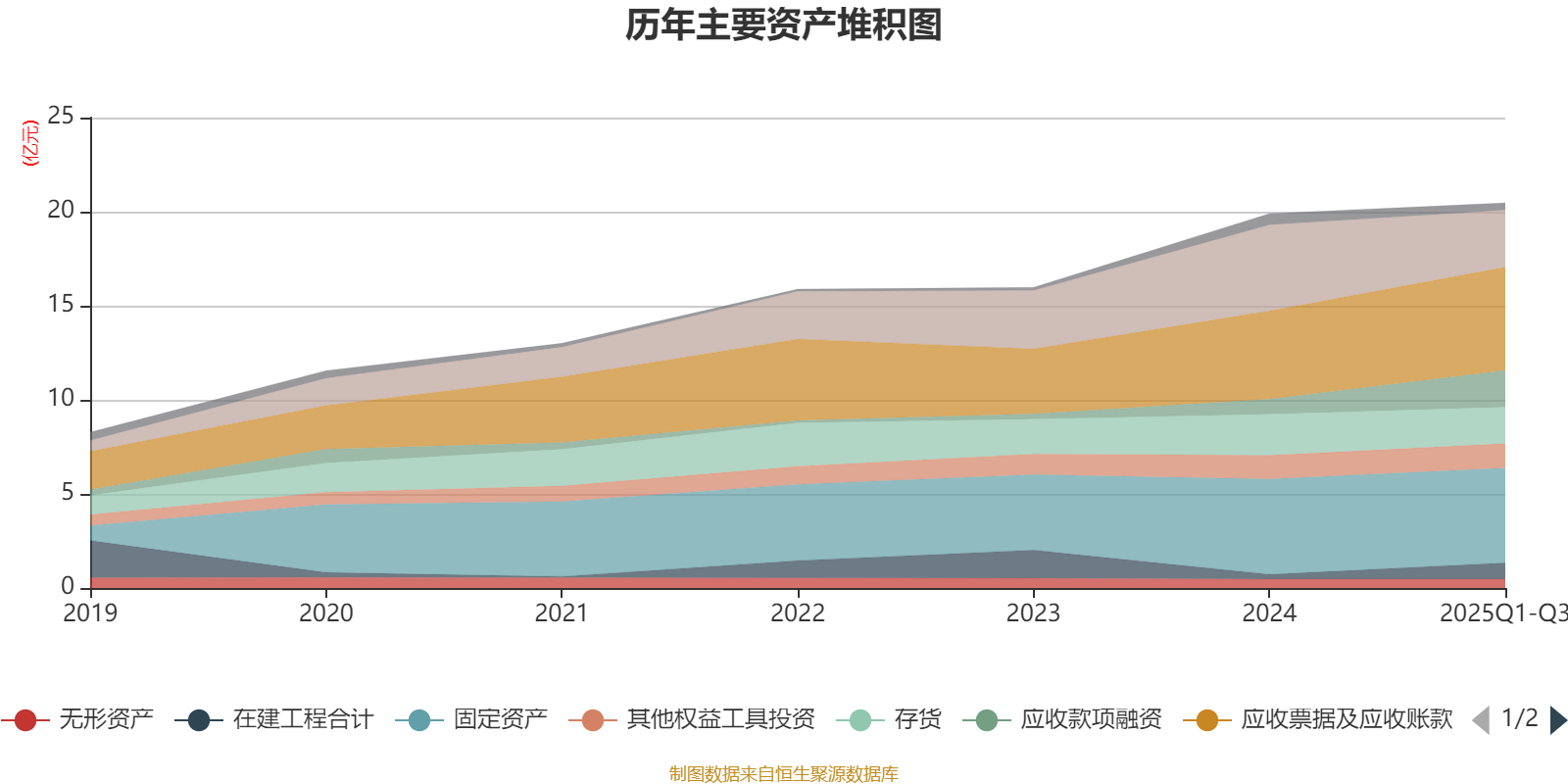 资产重大变化方面,截至2025年三季度末,公司货币资金较上年末减少33.82%,占公司总资产比重下降8.19个百分点;应收款项融资较上年末增加139.26%,占公司总资产比重上升5.44个百分点;应收票据及应收账款较上年末增加17.34%,占公司总资产比重上升3.32个百分点;在建工程合计较上年末增加236.84%,占公司总资产比重上升2.95个百分点。