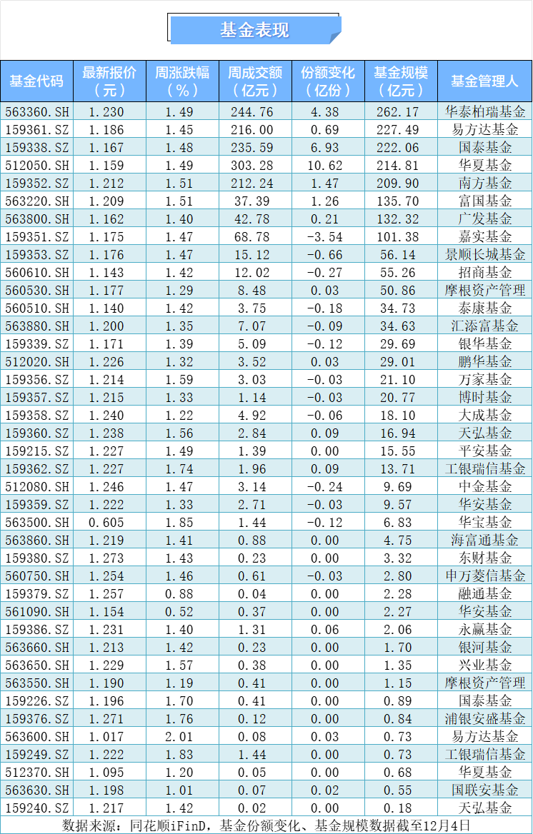 已跌破2000亿元,截至统计期末为1920.64亿元,规模前三为A500ETF华泰柏瑞、A500ETF易方达、国泰基金的中证A500ETF,分别为262.17亿元、227.49亿元、222.06亿元。