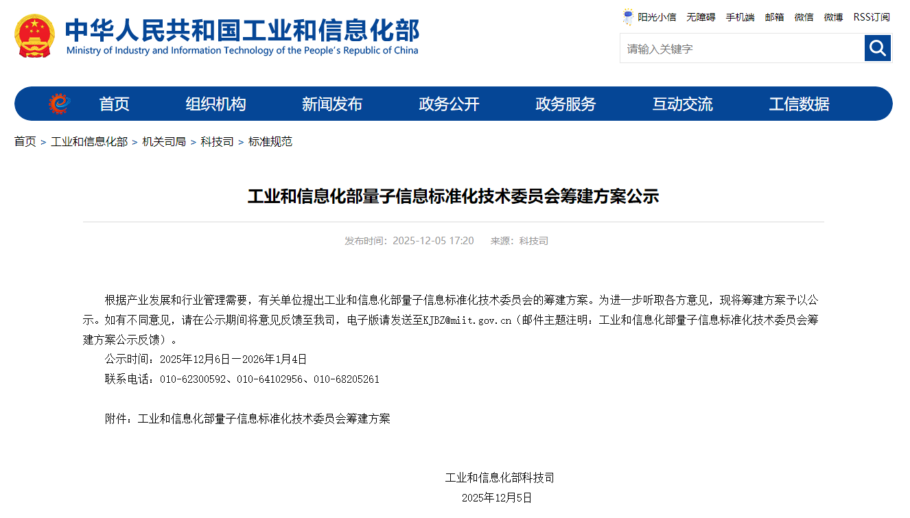 工业和信息化部拟筹建量子信息标准化技术委员会