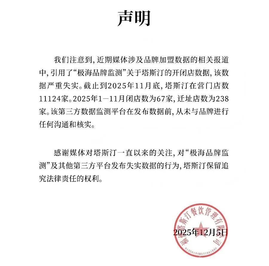塔斯汀回应“90天关907家门店”:第三方数据严重失实,今年前11月闭店67家