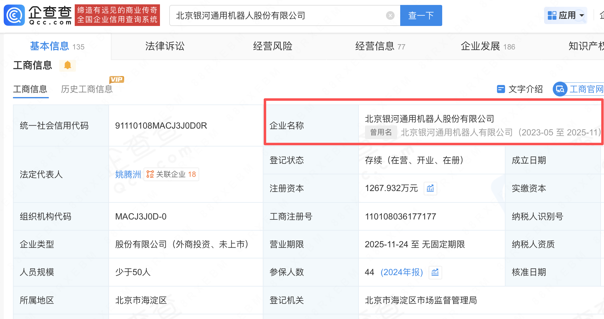 上证报中国证券网讯(记者窦世平)企查查信息显示,银河通用企业名称从“北京银河通用机器人有限公司”变更为“北京银河通用机器人股份有限公司”,企业类型从有限责任公司(外商投资、非独资)变更为股份有限公司(外商投资、非上市)。
