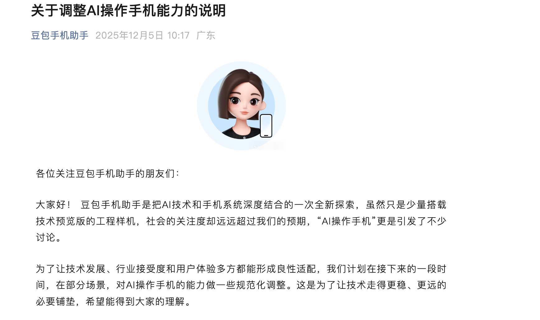 豆包表示,此次对AI操作手机的能力做一些规范化调整,是为了让技术走得更稳、更远的必要铺垫。