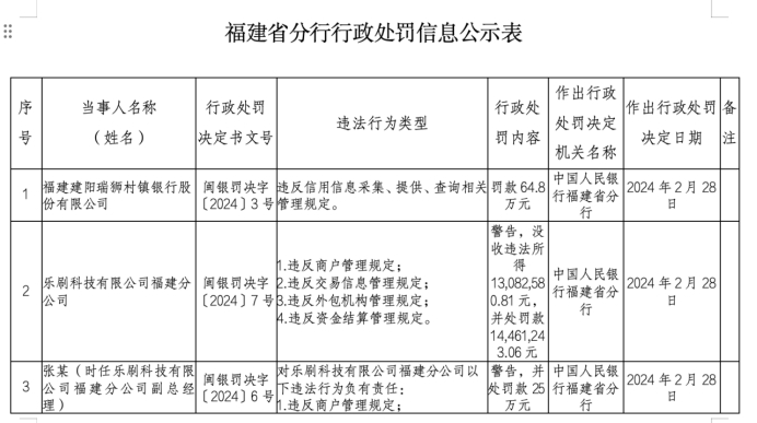 记者还注意到,乐刷支付曾被中国人民银行福建省分行处以高达2754.38万元的罚款。中国人民银行福建省分行行政处罚决定显示,2024年2月28日,乐刷支付福建分公司因违反商户管理规定、违反交易信息管理规定、违反外包机构管理规定、违反资金结算管理规定,被给予警告,没收违法所得1308.26万元,并处罚款1446.12万元,合计罚没约2754.38万元。