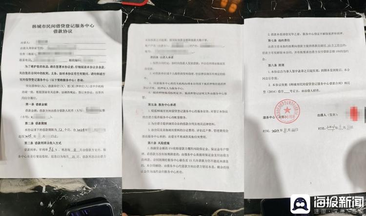 出借人手中的合同显示,该合同为《韩城市民间借贷登记服务中心借款协议》,该合同印章也为韩城民间借贷中心印章。海报新闻记者注意到,该合同有八项条款,包括借款金额、借款期限、借款利率及收入方式、出借人承诺、服务中心承诺、风险措施、违约责任和附则,但是没有任何融资人信息。