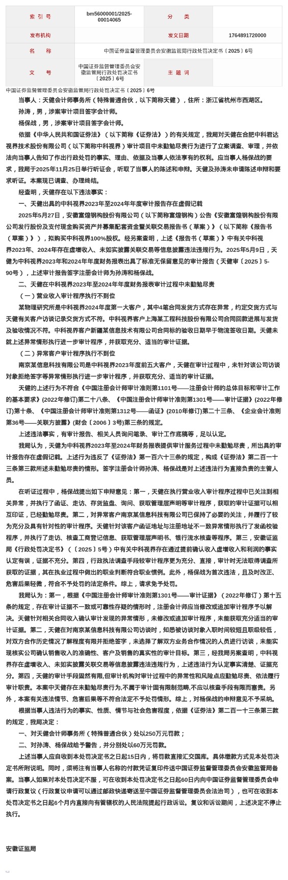 根据当事人违法行为的事实、性质、情节与社会危害程度,安徽证监局决定对天健会计师事务所(特殊普通合伙)处以250万元罚款;对孙涛、杨保战给予警告,并分别处以60万元罚款。