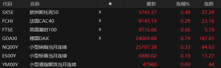 周五盘前,美股三大股指期货齐涨,欧洲主要指数普遍上涨。截至发稿,纳斯达克100指数期货涨0.33%,标普500指数期货涨0.19%,道指期货涨0.09%。