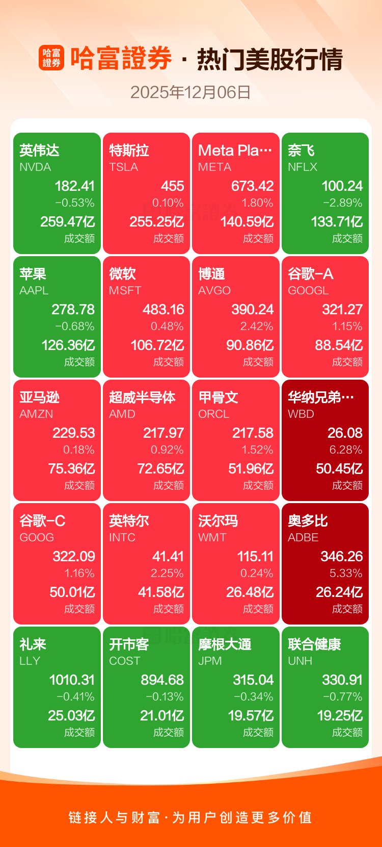 英伟达跌0.53%,特斯拉涨0.10%,Meta Platforms Inc-A涨1.80%,奈飞跌2.89%,苹果跌0.68%,微软涨0.48%,博通涨2.42%,谷歌-A涨1.15%,亚马逊涨0.18%,超威半导体涨0.92%。
