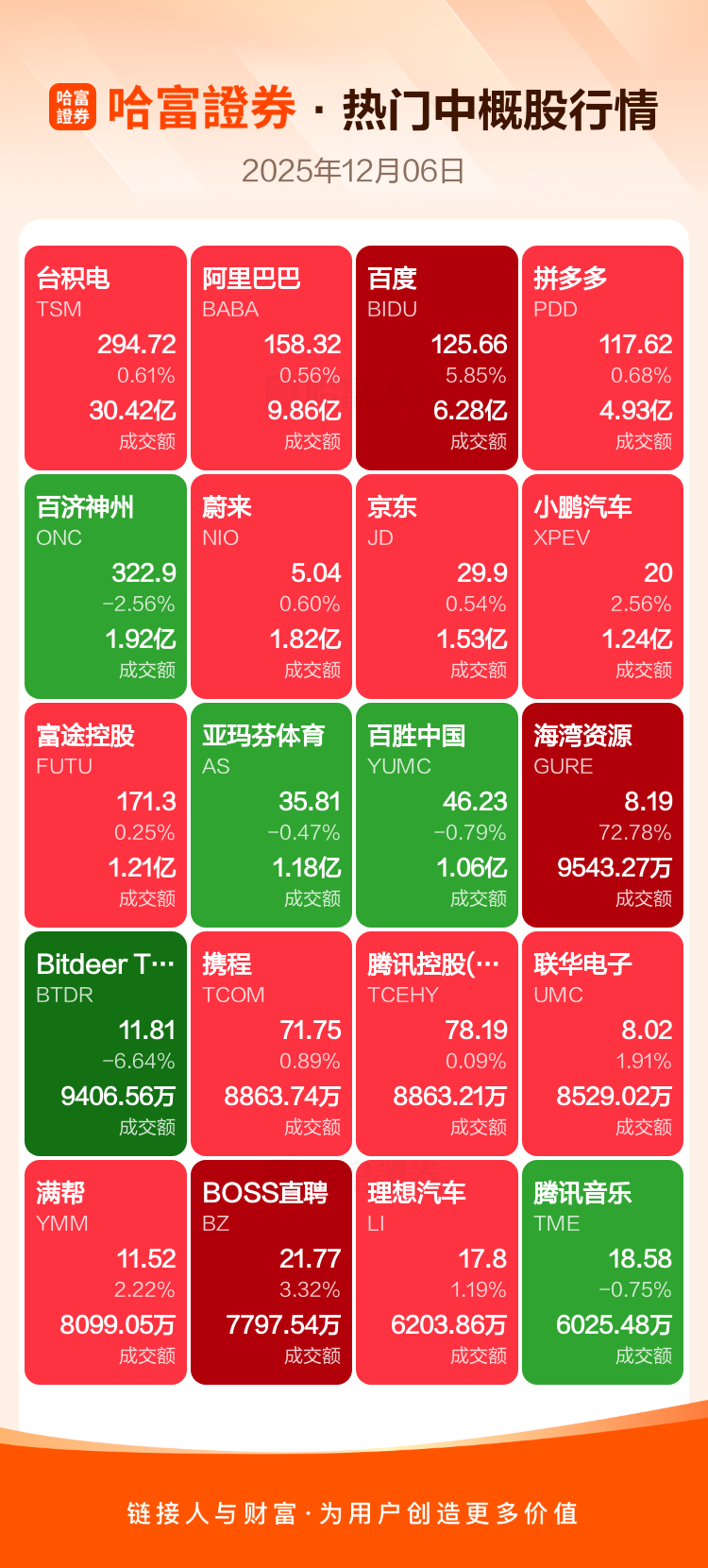 台积电涨0.61%,阿里巴巴涨0.56%,百度涨5.85%,拼多多涨0.68%,百济神州跌2.56%,蔚来涨0.60%,京东涨0.54%,小鹏汽车涨2.56%,富途控股涨0.25%,亚玛芬体育跌0.47%。