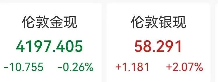 贵金属方面,金价小幅下挫,失守4200美元关口,现货白银涨超2%报58.29美元/盎司。