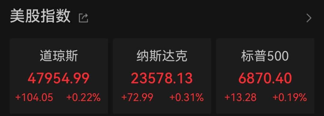 当地时间周五,美国三大股指小幅收涨,道指涨0.22%报47995.499点,标普500指数涨0.19%报6870.4点,纳指涨0.31%报23578.13点。其中,标普500指数、纳指收获四连涨。本周,道指涨0.5%,标普500指数涨0.31%,纳指涨0.91%。