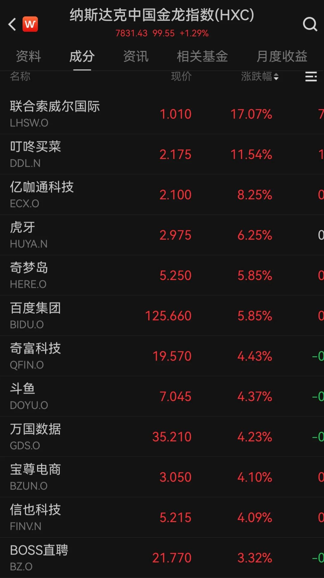 中概股多数上涨,纳斯达克中国金龙指数涨1.29%,万得中概科技龙头指数涨0.66%。个股方面,百度集团涨近6%,奇富科技、万国数据、信也科技涨逾4%,BOSS直聘涨超3%。