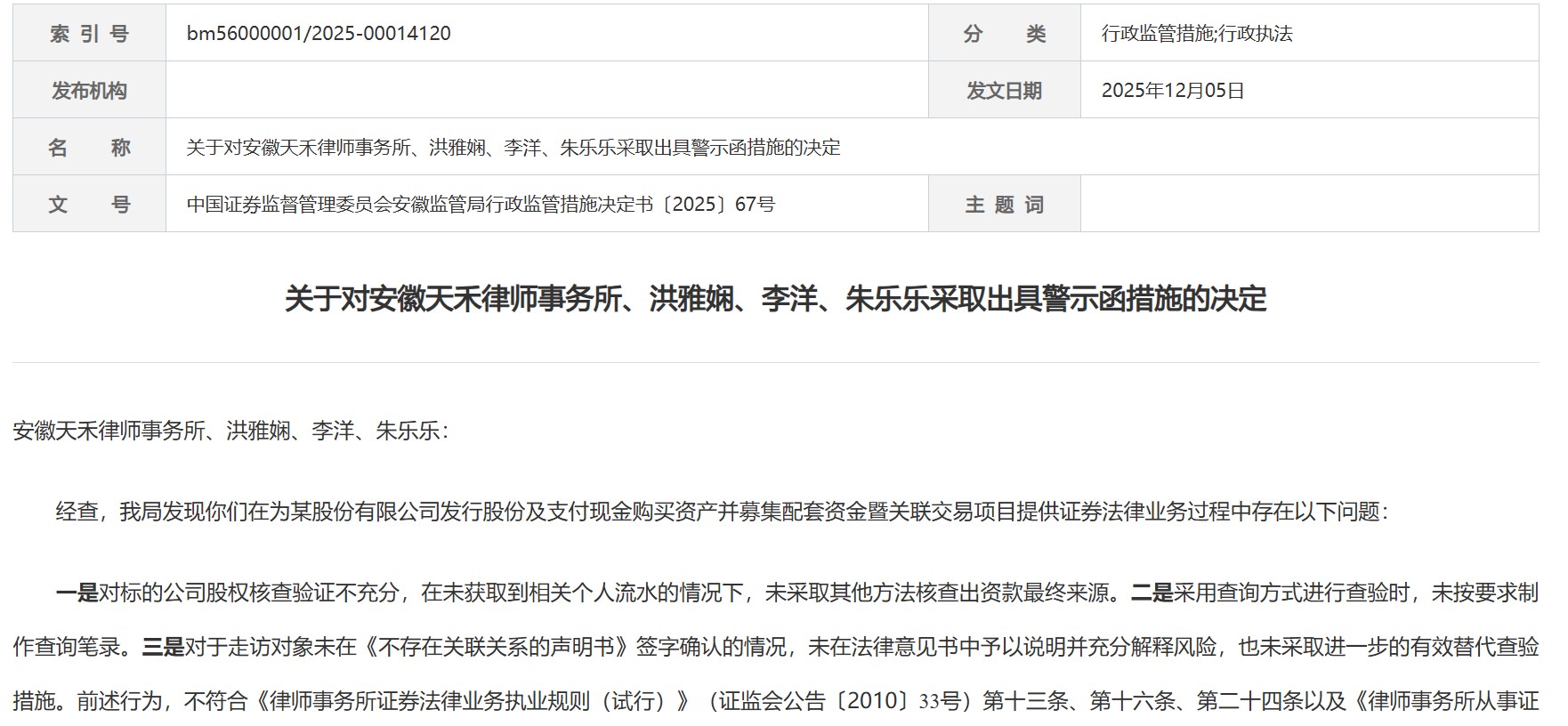 安徽证监局官网2025年12月5日发布关于对安徽天禾律师事务所(以下简称天禾律所)、洪雅娴、李洋、朱乐乐采取出具警示函措施的决定(以下简称决定)。