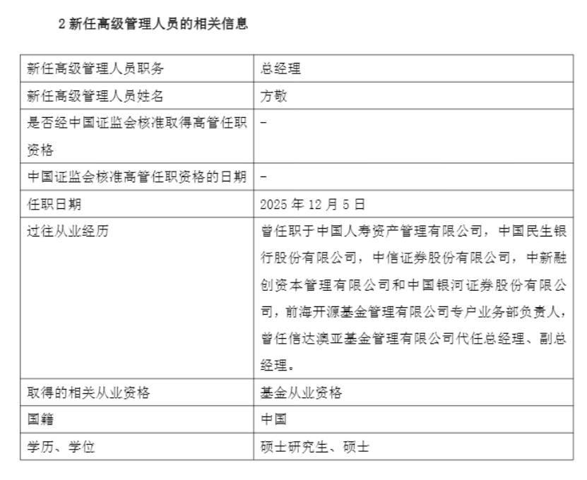 12月5日晚,信达澳亚基金发布公告披露,方敬自12月5日起正式任职公司总经理,至此结束代任状态。