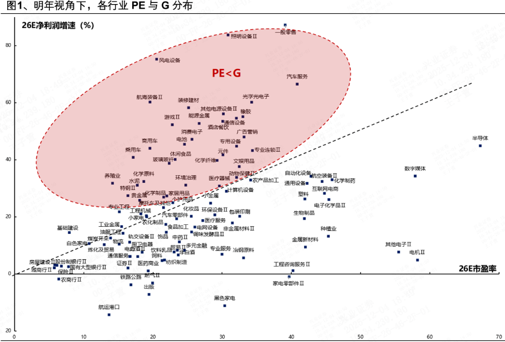 明年视角看,PE-G框架下当前估值仍相对便宜的行业主要集中在科技、高端制造、周期资源品、新消费&服务消费领域,包括:通信设备、元件、消费电子;新能源(电池、风电设备)、汽车;有色(能源金属、贵金属、工业金属)、化工等。